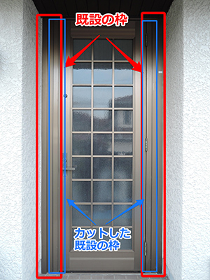 その一つが既設の縦枠の見付 (=正面から見える部分やその幅。『住宅建築専門用語辞典』より) 部が太いということ。