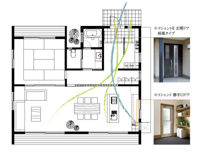 採風に優れたドアで空気を循環させれば室温や湿度を保つ効率を高め、エアコンの電力やCO2の排出を低減できます。さらに、「採風」と、「断熱」を組み合わせることで、環境にも家計にも優しい住まいを実現できます。