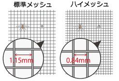 断熱仕様はオプションでハイメッシュ(細かい網の目)をお選びいただけます。アルミPG/SG仕様は標準メッシュのみとなります。