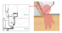ピボットヒンジを框の中に隠すことで、吊元側の隙間が小さくなり、小さなお子様でも指をはさみにくい構造です。